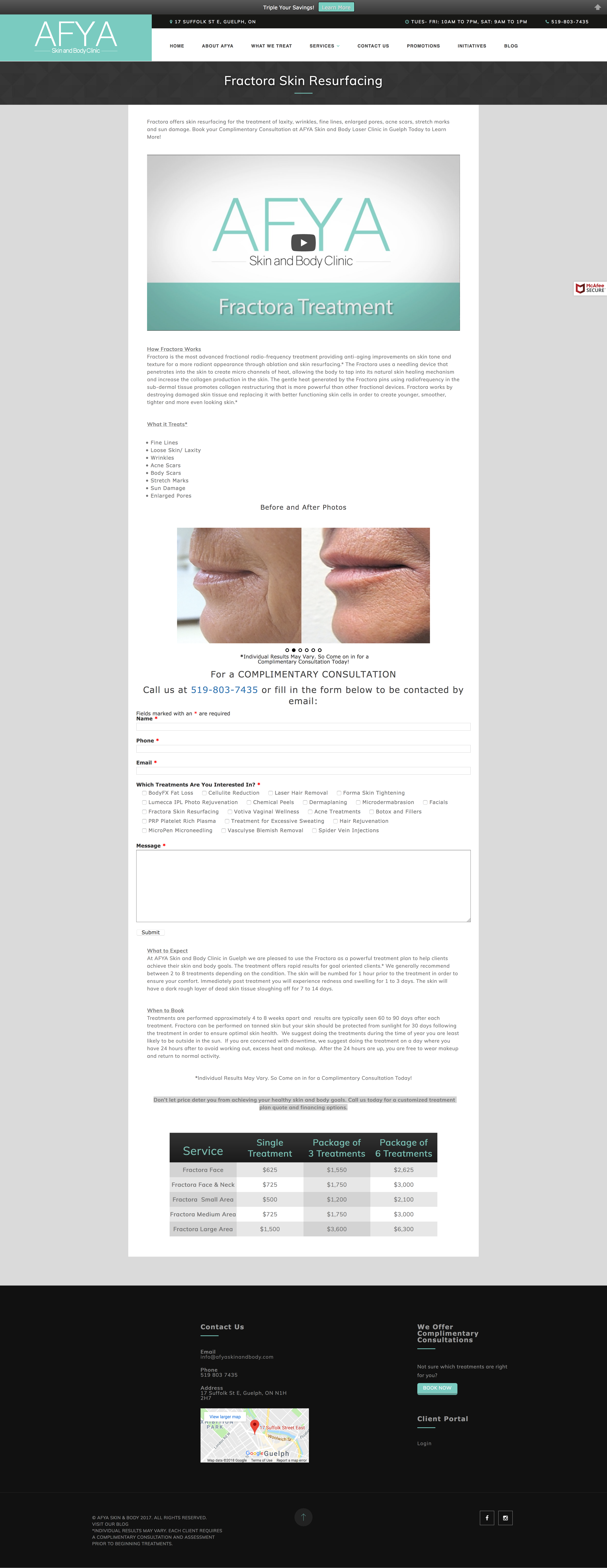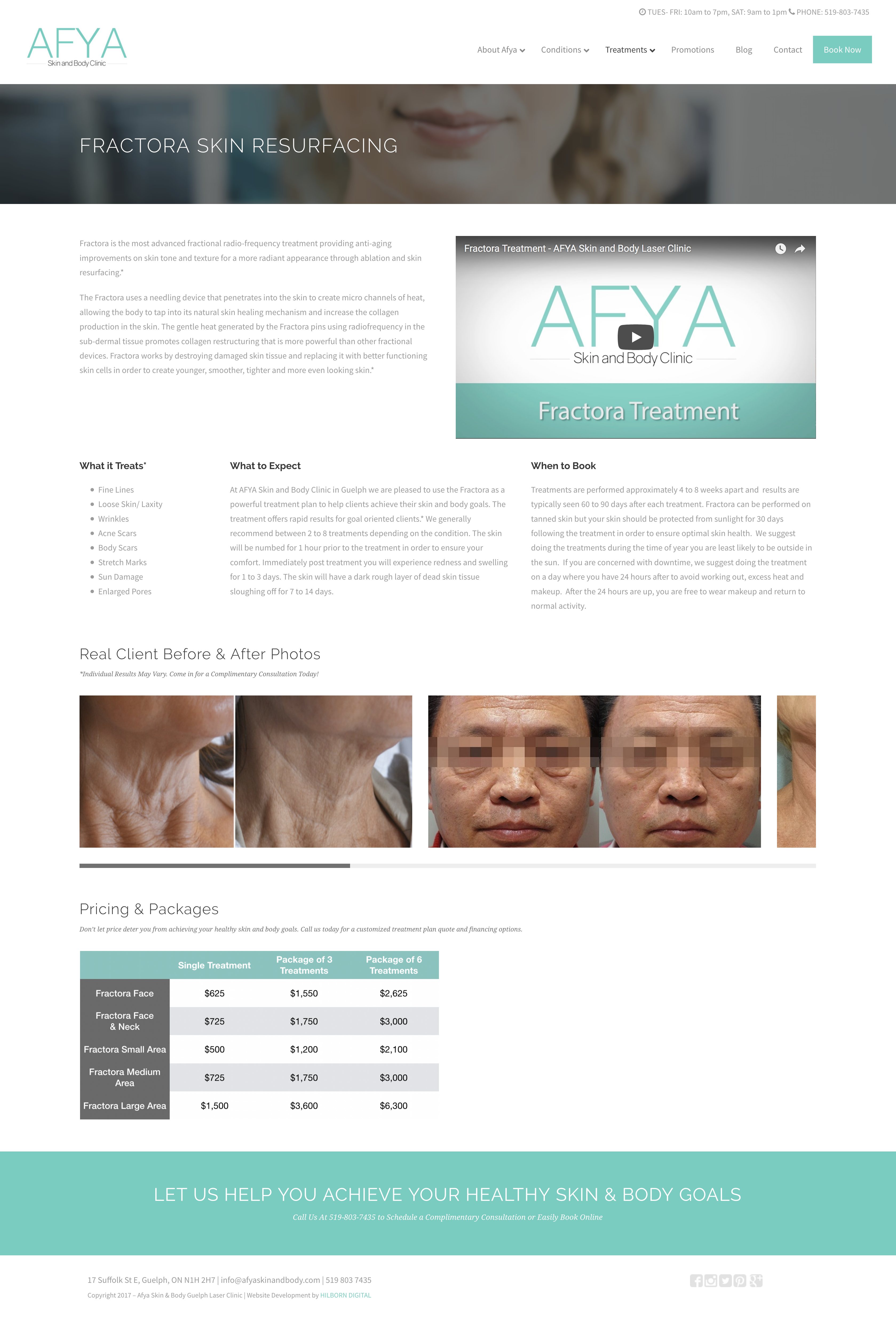AFYA offers over 25 treatment solutions for over two dozen skin conditions and concerns, with their most popular service being laser hair removal. Hilborn Digital improved the user experience of each of these treatment pages to make it easier for clients to find the service they're looking for, view before & after photos, and get key information quickly. We also brightened the overall design of the website and opted for a clean, neutral, modern aesthetic.